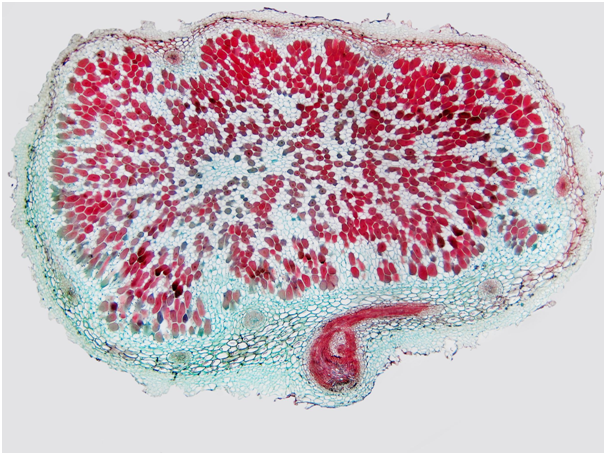 The picture shows a cross-section of a root nodule formed by the nitrogen-fixing bacteria Rhizobium in symbiosis with a plant from the legume family. Within the nodule, bacteria convert atmospheric nitrogen into a plant-available form. Several key minerals drive this vital process. Legume plants secrete flavonoids through their roots to attract rhizobia bacteria. In turn, the bacteria produce signalling molecules called nod factors that initiate the formation of nodules on the plant’s roots. The nodules house the bacteria and serve as an in-house nitrogen factory. The intracellular movement of calcium mediates the complex dialogue between the plant and bacteria.